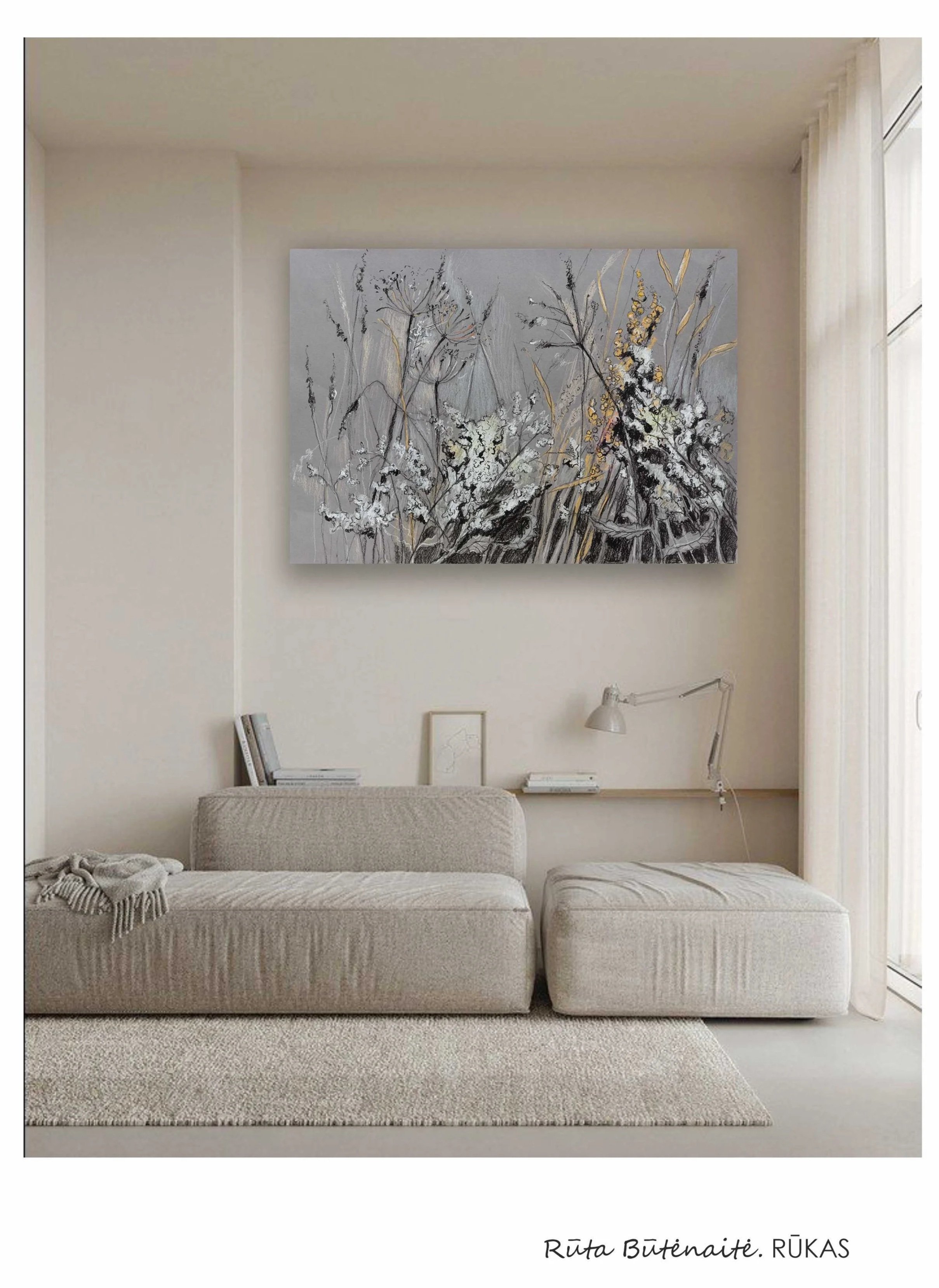 Kas vis gi nutars pasekti PANTONE 2026 metų spalvos pasiūlymu ir neutralus, lengvas, simbolizuojantis ramius apmąstymus "Debesų šokėjas" taps namų erdvių spalva, užsukite pasižvalgyti ir tiek koloritu, tiek emociškai tinkančių prie šio atspalvio, Rūtos Būtėnaitės piešinių reprodukcijų: